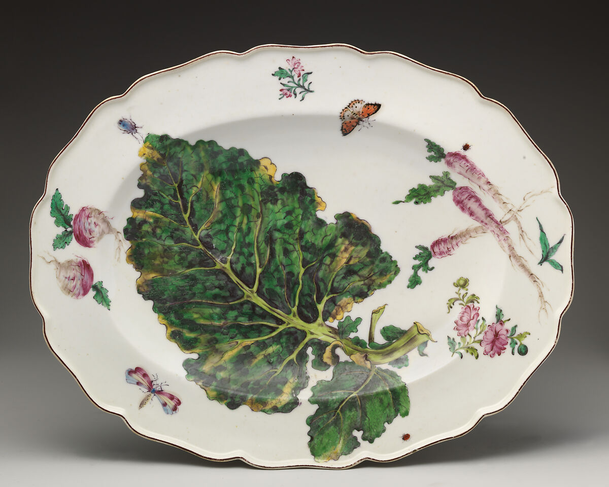 These botanical plates (2016.217–.226) were produced by the Chelsea factory around 1755 and are often referred to as Chelsea "Hans Sloane" wares, in reference to the royal physician, traveler, and natural historian who helped transform the Chelsea Physic Garden into a center of botanical knowledge during the British Enlightenment. Several subjects depicted on these plates were taken from botanical illustrations published by Philip Miller, curator of Chelsea Physic Garden. Although flowers and fruits could typically be found on earlier porcelain wares from Meissen, the lively naturalism of the Chelsea botanical plates reflects a broadening public interest in the natural world, and evidence the forms of global commerce that brought exotic species from the Caribbean, the Americas, and Asia to England.