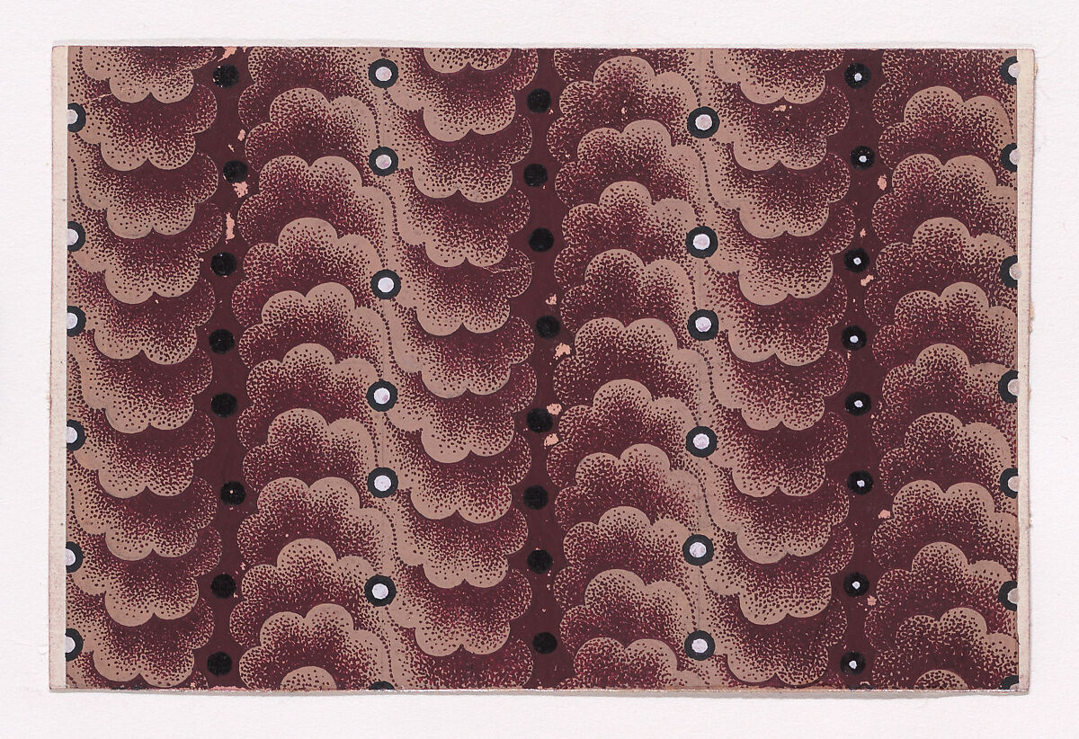 Rectangular sheet of paper with a textile design from a group, dated 1840, made in Mulhouse, Alsace which was an important nineteenth-century center for textile production in the Haut-Rhin region of France. The design is made of vertical strips of overlapping clouds rendered with dark reddish-brown stipples over a light tan base and with a strip of white circles with black borders running along the center of the clouds, which are framed by vertical strips of circles of black color over a dark reddish-brown ground.