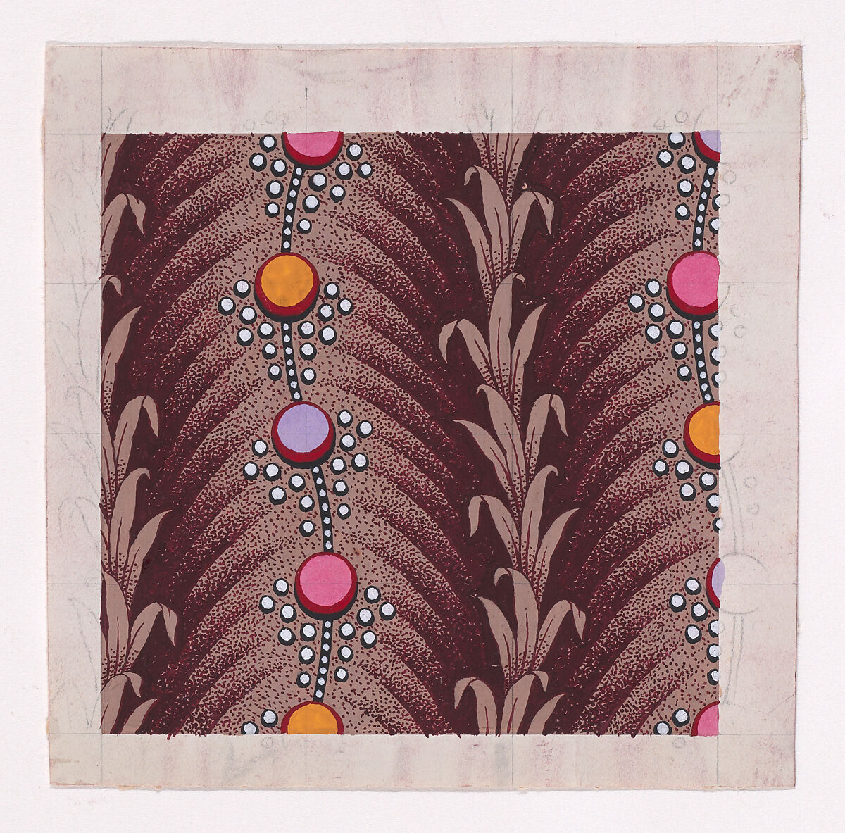 Rectangular sheet of paper with a textile design from a group, dated 1840, made in Mulhouse, Alsace, which was an important nineteenth-century center for textile production in the Haut-Rhin region of France. The design is composed of a dark reddish-brown base and alternating vertical garlands of stylized leaves of light tan color with stems of dark reddish-brown color, and undulating circles joined by a branch and surrounded by pearls over a spine of overlapping scales in light tan color shaded with stipples of dark reddish-brown color. The circles are of pink, orange, and purple color, with dark red border and a black shade; the pearls are colored in white, with black border and shade; the joining branch is colored in black and decorated with small white pearls.