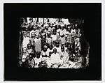 Untrimmed black and white photograph Black and white photograph (printed by Jerry L. Thompson in 1975, NY.) The subjects are situated on a canvas-like rug and grouped around the seated chief who wears a prestige cloth over his left shoulder. He is surrounded by thirty-three figures, including men, women and children and ranging in age from infancy to elderly. Multiple rows of figures are standing beside and behind the chief while another group is seated on the ground in front of him. All the subjects gaze directly into the camera. Behind the entourage is a line of hanging laundry, indicating that this photograph was probably taken outdoors.