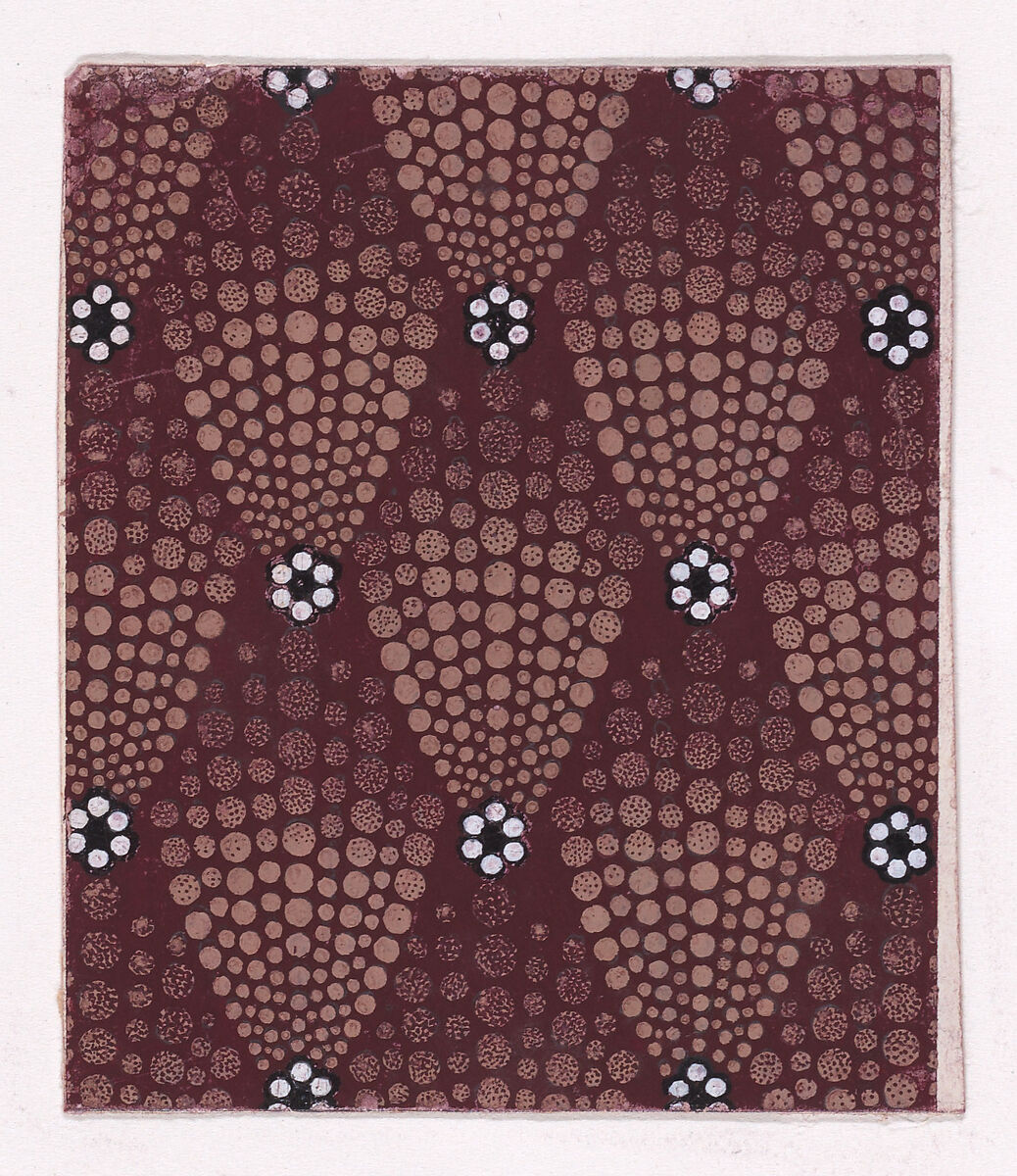 Rectangular sheet of paper with a textile design from a group, dated 1840, made in Mulhouse, Alsace, which was an important nineteenth-century center for textile production in the Haut-Rhin region of France. The design is made up out of alternating rosettes of six pearls flanked above with abstract palmettes of dots of light tan color over a dark reddish-brown ground. Stipples in dark reddish-brown create shadows towards the bottom of the dotted palmettes.