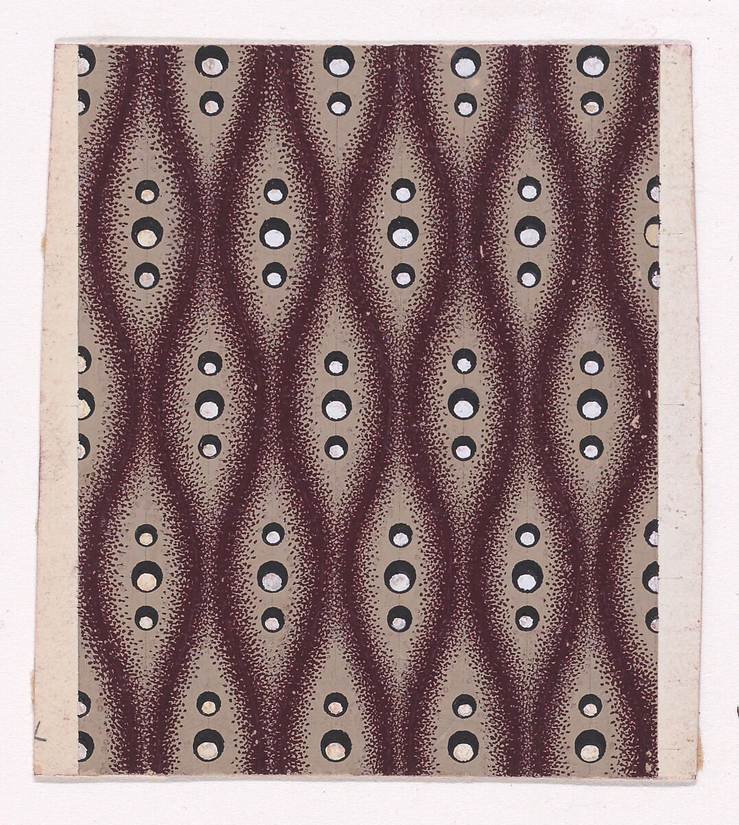 Rectangular sheet of paper with a textile design from a group, dated 1840, made in Mulhouse, Alsace, which was an important nineteenth-century center for textile production in the Haut-Rhin region of France. The design is made up of alternating strips of groups of three pearls framed by alternating vertical undulating garlands stippled with brown color over a base of dark greenish-cream color. The pearls are colored with white.