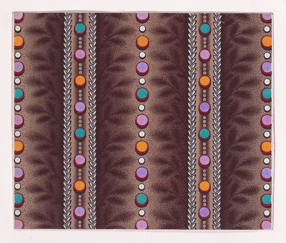 Rectangular sheet of paper with a textile design from a group, dated 1840, made in Mulhouse, Alsace, which was an important nineteenth-century center for textile production in the Haut-Rhin region of France. The design is made up of vertical strips of pearls joined by groups of three smaller pearls of light tan color framed by two vertical strips of alternating stylized leaves of white color with offsets of scrolling branches with leaves rendered with dark reddish-brown stipples, separated by strips of alternating pearls of two sizes, the smaller ones colored with white. The larger pearls are colored with green, orange and purple. The base of the design is of light tan color.