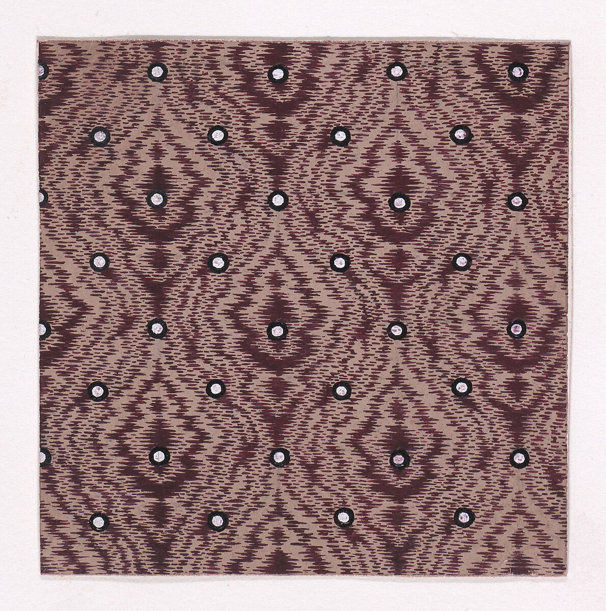 Rectangular sheet of paper with a textile design from a group, dated 1840, made in Mulhouse, Alsace, which was an important nineteenth-century center for textile production in the Haut-Rhin region of France. The design is made up of alternating rows of pearls of white color over an abstract background simulating tie-dye of dark reddish-brown color over a light tan base.