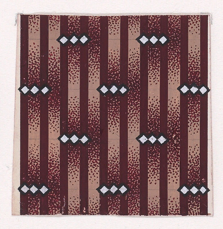 Rectangular sheet of paper with a textile design from a group, dated 1840, made in Mulhouse, Alsace, which was an important nineteenth-century center for textile production in the Haut-Rhin region of France. The design is made up of alternating vertical rows of horizontal strings of three touching lozenges with a stippled shade of dark reddish-brown color over a striped background of light tan and dark reddish-brown color. The lozenges are of white color and have black outlines.