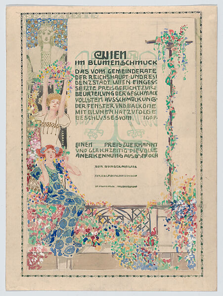 The Viennese urban landscape is known for its beautifully decorated façades, both in their permanent architectural decorations and the ephemeral floral additions. This custom was greatly encouraged by the Viennese city council which awarded its citizens, not for the most abundant but for the most tastefully decorated balcony and window displays. Puchinger’s designs for the winner’s certificate echo the works of his colleague Gustav Klimt in their rich interplay between the three-dimensional flora and the two-dimensional patterns they inspired.