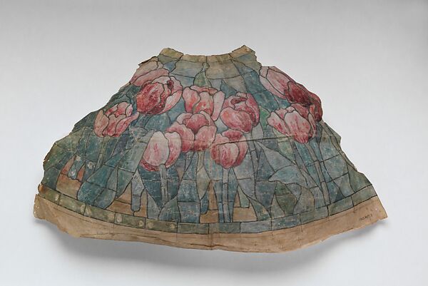 Floral motifs dominate some of the most evocative nature-inspired lampshades produced by Tiffany Studios. The tulip was a popular subject and as this sample pattern shows, the colors range from rich pink and deep red to a range of blues and greens for the foliage. This watercolor rendering on linen represents the first step in the making of a Tiffany Studios lampshade. Once approved, the sample pattern was then translated into a working cartoon (1980.497.14) used for the actual cutting of the individual glass pieces to create a lampshade. This pattern is part of a group of tools and objects, including a workbench, given to the Met by John Dikeman (1882–1967), the last head of the lampshade shop at the firm. (For example, see 1980.497.1-.9,.15, .23-.25).