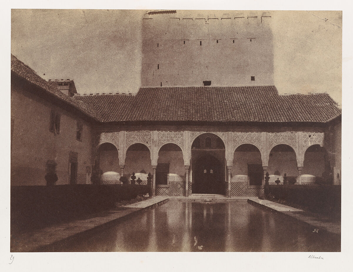 One of the most talented students of famed French photographer Gustave Le Gray, Delaunay was virtually unknown before a group of his photographs appeared at auction in 2007. Subsequent research led to the identification of several bodies of work, including the documentation of contemporary events through instantaneous views captured on glass negatives. Delaunay also was a particular devotee of the calotype (or paper negative) process, with which he created his best pictures—including this view of the Alhambra. Among a group of pictures he made between 1851 and 1854 in Spain and Algeria, this view of the Patio de los Arrayanes reveals the extent to which Delaunay was able to manipulate the peculiarities of the paper negative. He revels in the graininess of the image, purposefully not masking out the sky before printing the negative, so that the marble tower appears somehow carved out of the very atmosphere that surrounds it. In contrast, the reflecting pool remains almost impossibly limpid, its dark surface offering a cool counterpart to the harsh Spanish sky.
