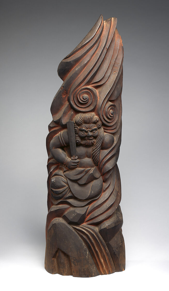 Statues of the Buddhist protective deity Fudō Myōō, the “immovable wisdom king,” are a familiar sight at temples in Japan. In contrast to meticulously carved works by professionals, this type of roughly hewn sculpture is the creation of an amateur monk-sculptor, Mokujiki, who was motivated by religious enthusiasm to make thousands of sculptures of Buddhist deities and popular gods of good fortune. His sculptures were rediscovered in the early twentieth century by art critic Yanagi Sōetsu (1889–1961), an advocate of the of Mingei, or “people’s art.” Yanagi admired the direct, unaffected power of Mokujiki’s sculpture, which he saw as representing the ideal of an indigenous, popular Japanese art. While Mokujiki’s technique is referred to as natabori (“hatchet-carved”), the artist actually used round-headed chisels.