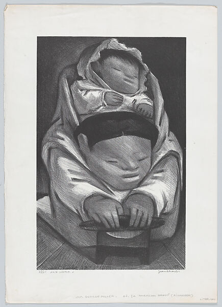 - Title: Rest and Work; a woman making a tortilla with a child on her back