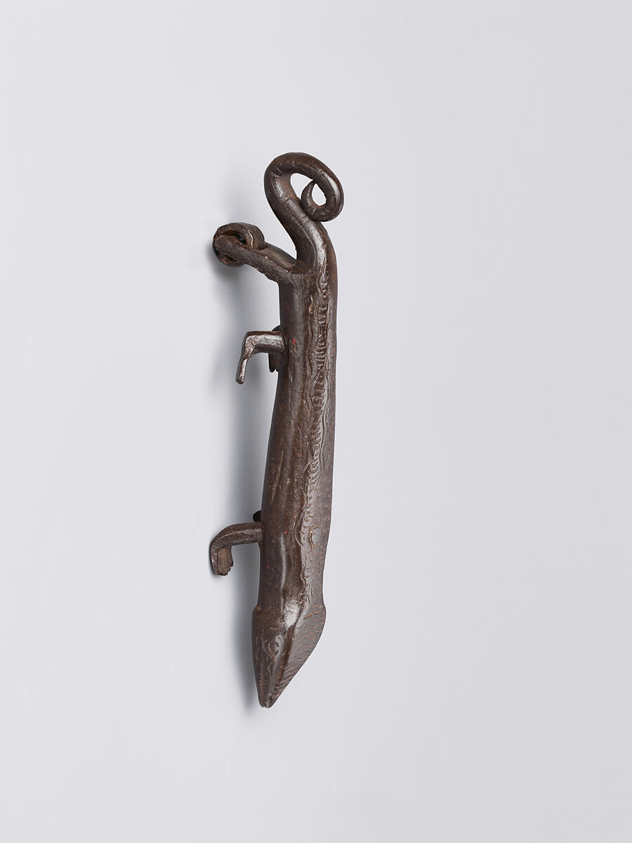 This door knocker is in the shape of a salamander with a long flat body, a pointed head, a lowered tail curled upwards all supported on four short legs. The surface is chiseled with wavy lines and short parallel curves indicating the animal's rough skin.