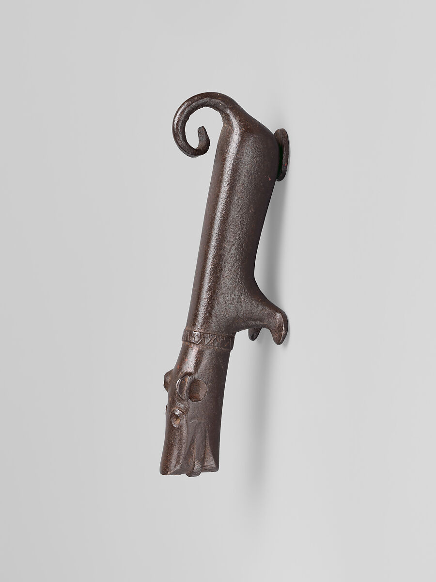The later Middle Ages was practically a second Iron Age, producing vast quantities of armor, weaponry and all manner of functional objects from nails to elaborate strap work hinges, ornate locks and household tools. A highly specialized craft, the best ironsmiths took pride in bringing decorative refinement to their works often elaborating surfaces that could not be seen and transfiguring the functional into the figural. These door knockers are fine examples of the wit, humor, and skill the best ironsmiths could bring to their products.