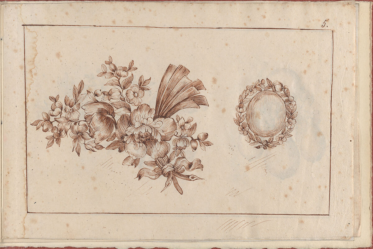 The designs in this drawing are copies after plates number 4 and 5 of the album of engravings by Van der Cruycen. Plate no. 4 has the design for a medallion and plate no. 5 has the design for a bouquet brooch.