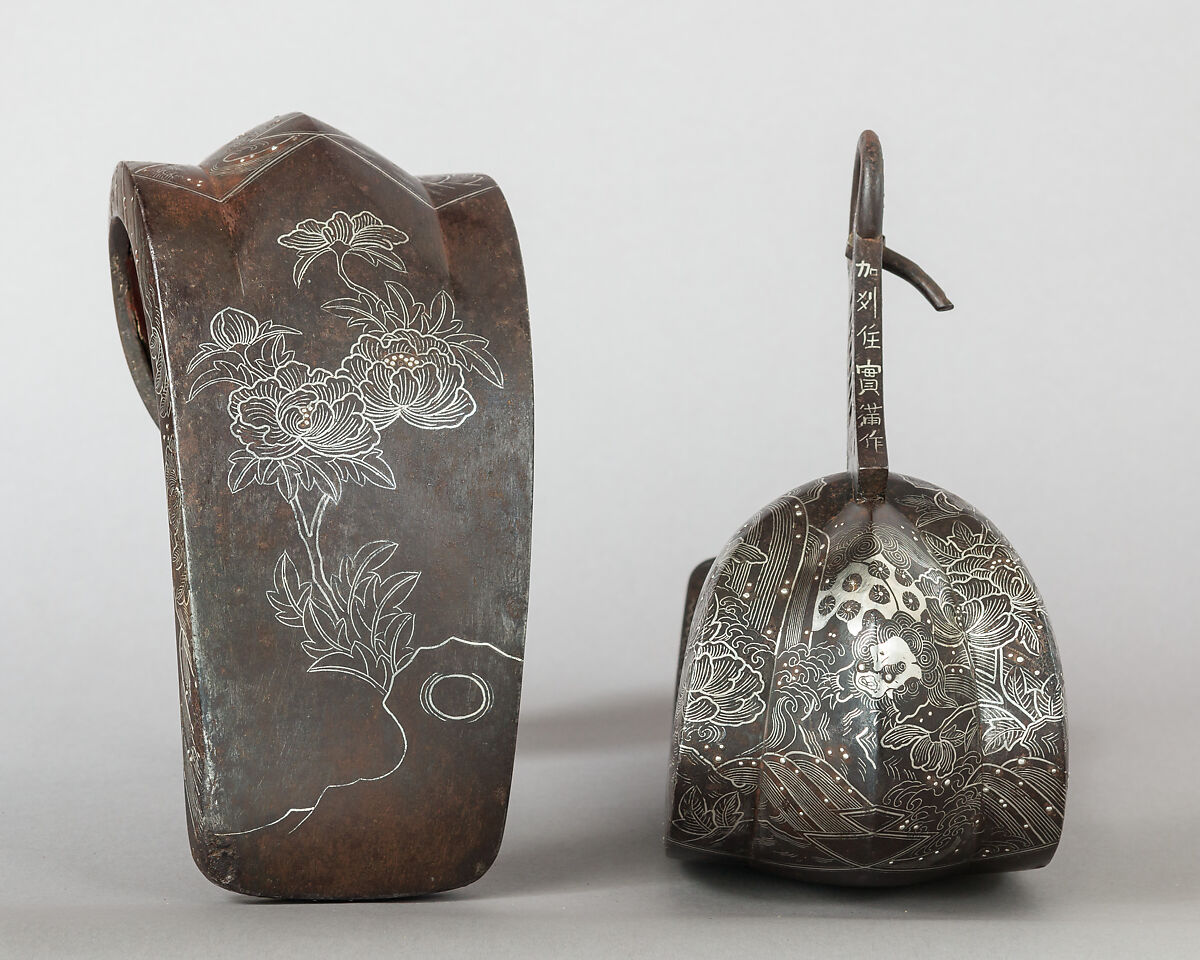 The form of these luxurious stirrups is known traditionally as hato mune (pigeon breast). They are completely covered with finely inlaid silver decoration, demonstrating the supreme level of craftsmanship achieved by their otherwise unknown maker, Sanemitsu. The beautiful designs include Chinese lions, peonies, and a waterfall flowing into a brook. This is the only known pair of stirrups to use raised silver dots as a technique to highlight and accentuate the decoration. The stirrups were made in Kashu (now Kanazawa City, Ishikawa Prefecture), probably under the patronage of the Maeda clan, lords of Kaga and one of the most powerful families in Japan at the time.