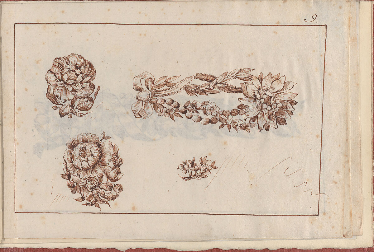 Ninth page of a small album containing drawings with jewelry designs copied after the prints by L. van der Cruycen, "Nouveau Livre de Desseins..." (New Book of Designs...), published in Paris in 1770. This page contains designs for two flower brooches, a small brooch and a large corset brooch, all of them characteristic of the style in vogue during the reign of Louis XVI in France, displaying a serendipitous flavor, with asymmetrical forms, "rocaille" and stylized natural motifs, and heavily decorated with flowers, ribbons and tassels, thus representing the taste of the Rococo style, which was fashionable in France and Europe during the eighteenth century. The elaborately carved forms presented in the designs were particularly sought after during the third quarter of the eighteenth century, and were to be accomplished by skilled artisans who would work out the decorations by hand.