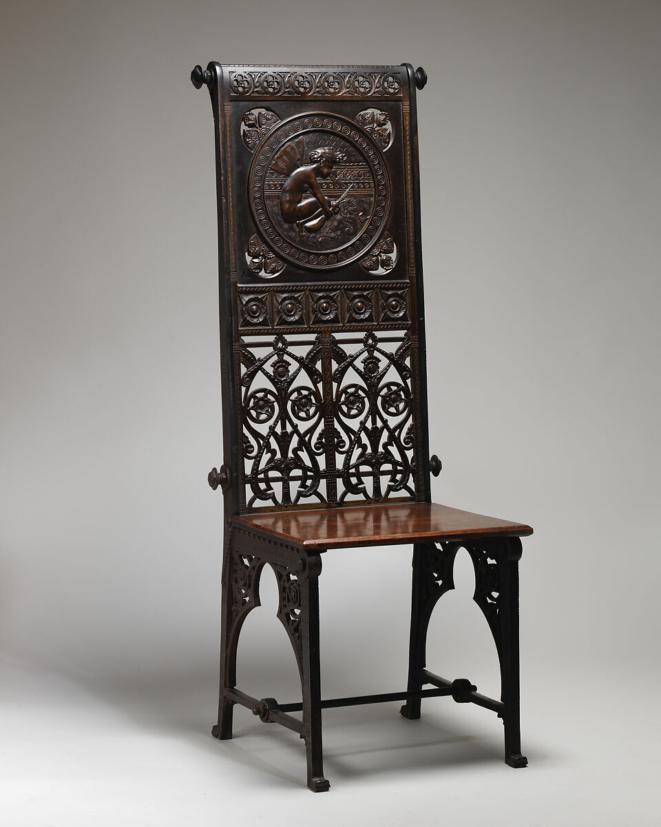 The versatile artist Christopher Dresser is often celebrated as the first industrial designer. Philosophically, he was aligned with his contemporary William Morris on the virtues of good design but unlike Morris, he did not distain industrial production methods. Rather than affiliating himself with a single company or starting a workshop of his own, Dresser worked as an independent designer for manufacturers in many media, including ceramics, metalwork, glass, furniture and textiles. This cast iron chair is emblematic of the marriage of design reform to industrial production.