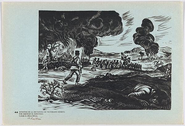 - Title: Plate 44: soldiers from the regime of Victoriano Huerta herding those who supported Emiliano Zapata and burning their homes, from "Estampas de la Revolución Mexicana" (Prints of the Mexican Revolution)