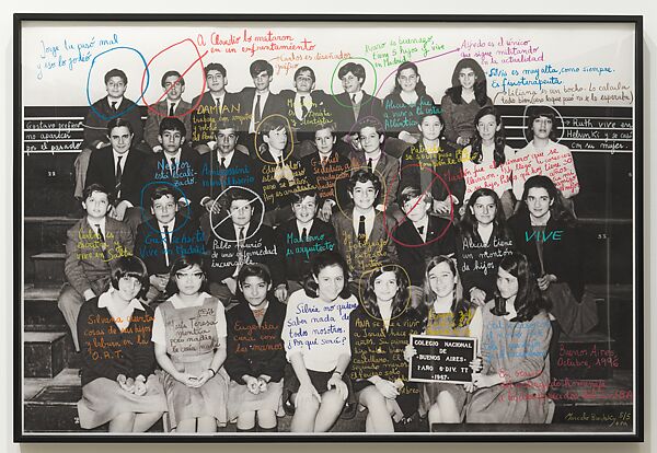 Brodsky returned to his native Argentina in 1994, after having fled the so-called Dirty War—a decade of state-sponsored terrorism during which opponents of the military dictatorship were "disappeared." Two years later, he organized a reunion of his eighth-grade class. During the war, one of their cohort had been murdered by the police and another had vanished. Reprinted at mural size, a photograph of Brodsky’s class in 1967 serves here as a living document for truth and reconciliation. After the reunion, the artist traveled to other countries, interviewing peers who had been unable to attend. Annotating his findings in crayon on the picture surface, he detailed the fates of some former classmates and excised others from the record with a poignant, definitive slash.