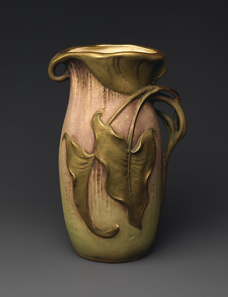The vase made at the Amphora Pottery in Austria likely served as a model from which the mold was taken to produce a vase of the identical organic form, but made in the United States at the Hampshire Pottery, in Keene, New Hampshire, ca. 1904-14. While the shape and relief decoration appear to be identical, the finish of the two are quite different. Here, the cream-colored body is embellished selectively with a greenish bronze finish, while the Hampshire example is covered in an allover matte green glaze, a finish that found great favor in American art pottery of the time.
