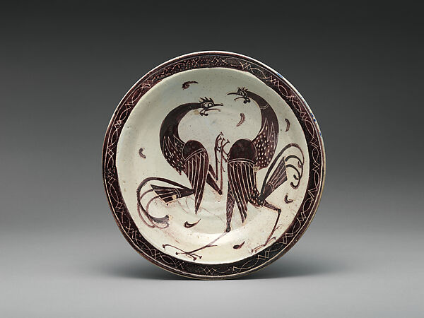 Wilhelm Hunt Diederich was a Hungarian-born artist, whose American mother was the daughter of famed architect William Morris Hunt. He studied painting and sculpture both in the United States and abroad. Like many of his era, he embraced several media, most notably paper cutouts and metalwork. By 1916 he was also working in clay. Diederich particular favored chargers or large plates like this one that served as blank canvases for his energetic designs. They can be most characterized as highly charged silhouetted forms, in this case a two cocks fighting, that echo his interest in a folk tradition of intricately cut paper popular in Austria and Switzerland. Typical of his designs in all media are the thin elegantly elongated bodies of the birds, which appear as highly expressive, almost whimsical forms. Diederich explored different traditions in clay, including a sgrafitto technique.