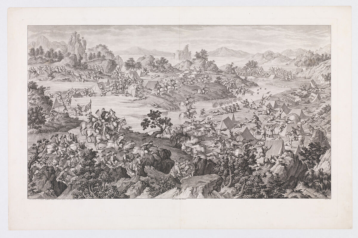 Part of a set of sixteen, "The Combat of Khurungui" was commissioned by the Qianlong Emperor in 1765 to commemorate Manchu victories (1755-59) over the Eleuths, the Dzungars, and other Central Asian peoples in the present-day region of Xinjiang. Made under the direction of Charles-Nicolas Cochin (1715-1790), the prints, which follow reduced-scale copies of paintings by Jesuit artists working in Beijing, were etched and engraved in France from 1767 to 1774 by the finest printmakers at the court of Louis XV. The Chinese merchants of Canton (present-day Guangzhou) paid for the copper plates and two hundred sets of prints to be delivered to China, with only a few sets retained in Paris.