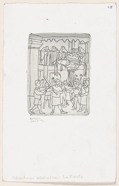 - Title: 'La Piñata' a blindfolded figure holding a stick surrounded by others