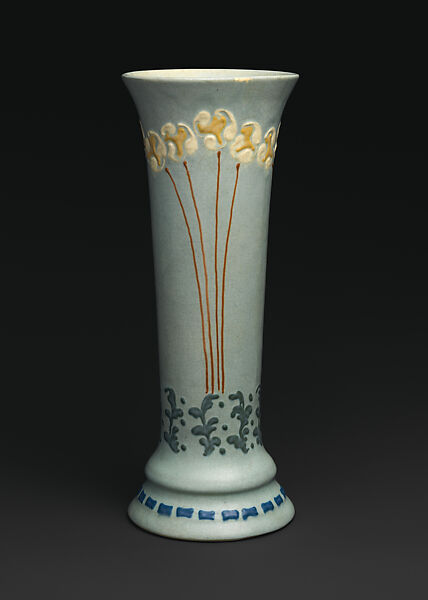 Rhead’s longest tenure in years and perhaps his most productive period, began when he started at the Roseville factory in late 1904. Given the large scale of Roseville’s production, he developed a number of different lines, with varied stylistic approaches and technical concerns. This vase is from his Aztec line, whose name might have sounded exotic, but whose designs bear no relation to Mesoamerican culture. Rhead’s designs were executed in the British squeeze bag technique, and as demonstrated here, hark back to English conventionalized design.
