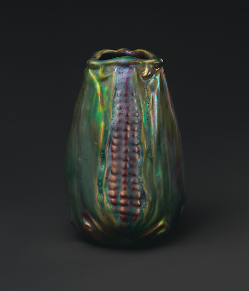 The Weller Pottery hired the French decorator Jacques Sicard to produce a new line of art pottery in 1902. It is distinguished by its elaborate decoration, usually painted on the surface in organic patterns, and its highly distinctive and unusual iridescent glazes. In this example, the organic quality is achieved by the molded form, the ears and husks of corn encompass the entire surface of the vase.