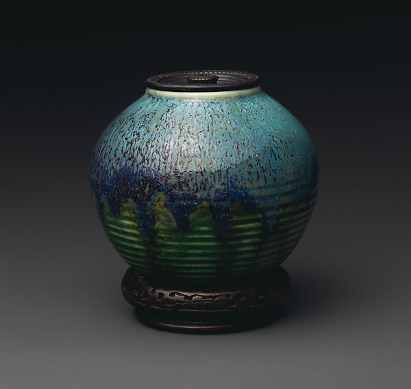 This nearly spherical vase shows pronounced throwing rings on its exterior surface, a feature found from time to time on Robineau’s work dating to the teens and twenties. A thick brilliant turquoise and blue glaze drips over the more translucent glaze below. Robineau often crafted decorative porcelain lids for vases that she felt were worthy. Here, the carved lid is covered in a matte gun-metal dark glaze to simulate metal. The Chinese or Chinese style wooden base bears an original paper label with Robineau’s monogram, indicating that it was original to the piece.