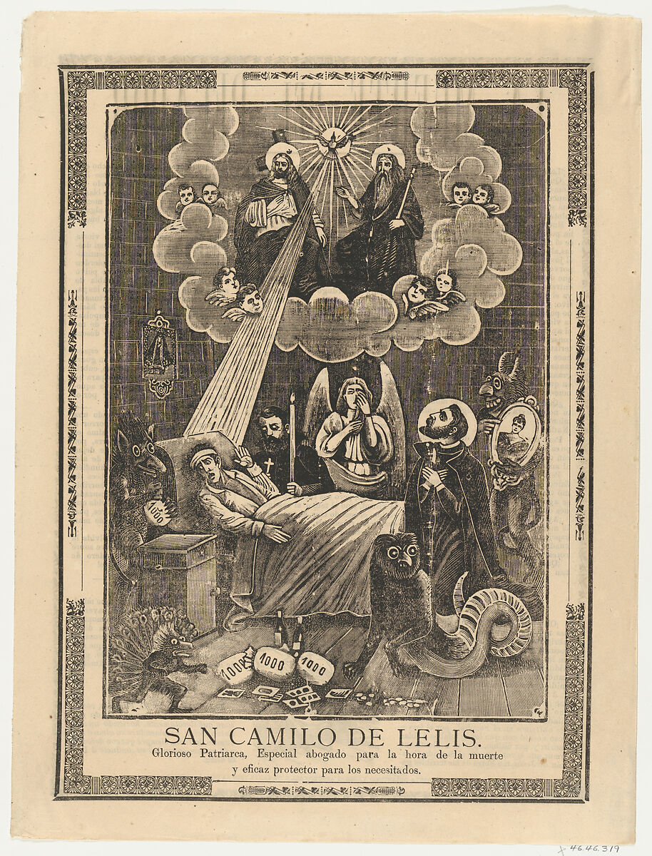 - Title:Broadsheet with Saint Camilo de Lelis in bed surrounded by demons, priests and the Holy Trinity above