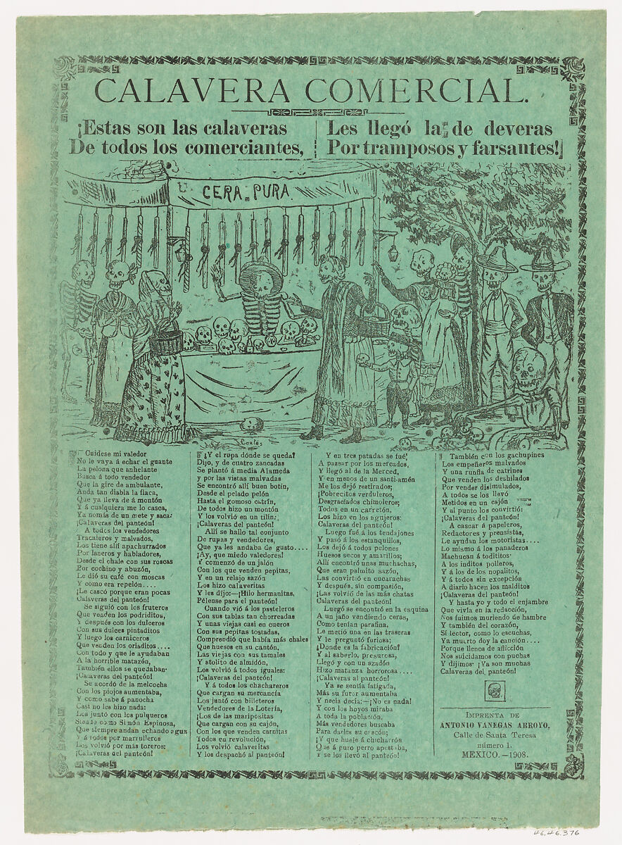 - Title: Broadsheet relating to commerical/business skeletons (Calavera Comercial) and charlatanism, many skeletons gather around a candle vendor