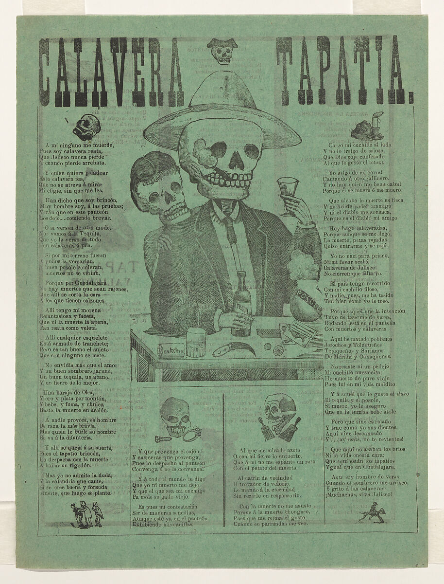 "Tapatía" here indicates that the figures are from the city of Guadalajara (Jalisco), though the term is also sometimes associated with an authentic Mexican identity. An elegantly dressed male skeleton smokes a cigar and drinks tequila while a female skeleton looks over his shoulder. Written in the first person in a gloating tone, the rhyming quatrains surrounding the image explain how the skeleton has defeated adversaries from other states. Text on the back of the print describes negative aspects of working-class occupations and ends with a song about the bravery of people from Guadalajara.