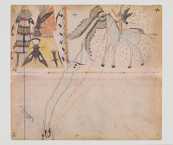 Here, an artist vividly represents the transformative moment of a medicine vision on a double-page spread of a ledger book once owned by fellow artist Frank Henderson. The individual undergoing this experience at the lower left communicates through wavy lines with a composite supernatural being astride a horse. A dense cloud of flying bullets surrounds the horse but leaves the protagonist unharmed, suggesting the protective power of the vision. The split-horn headdress, painted tipi, and eagle feather staff at left are all signs of exceptional accomplishments in leadership.