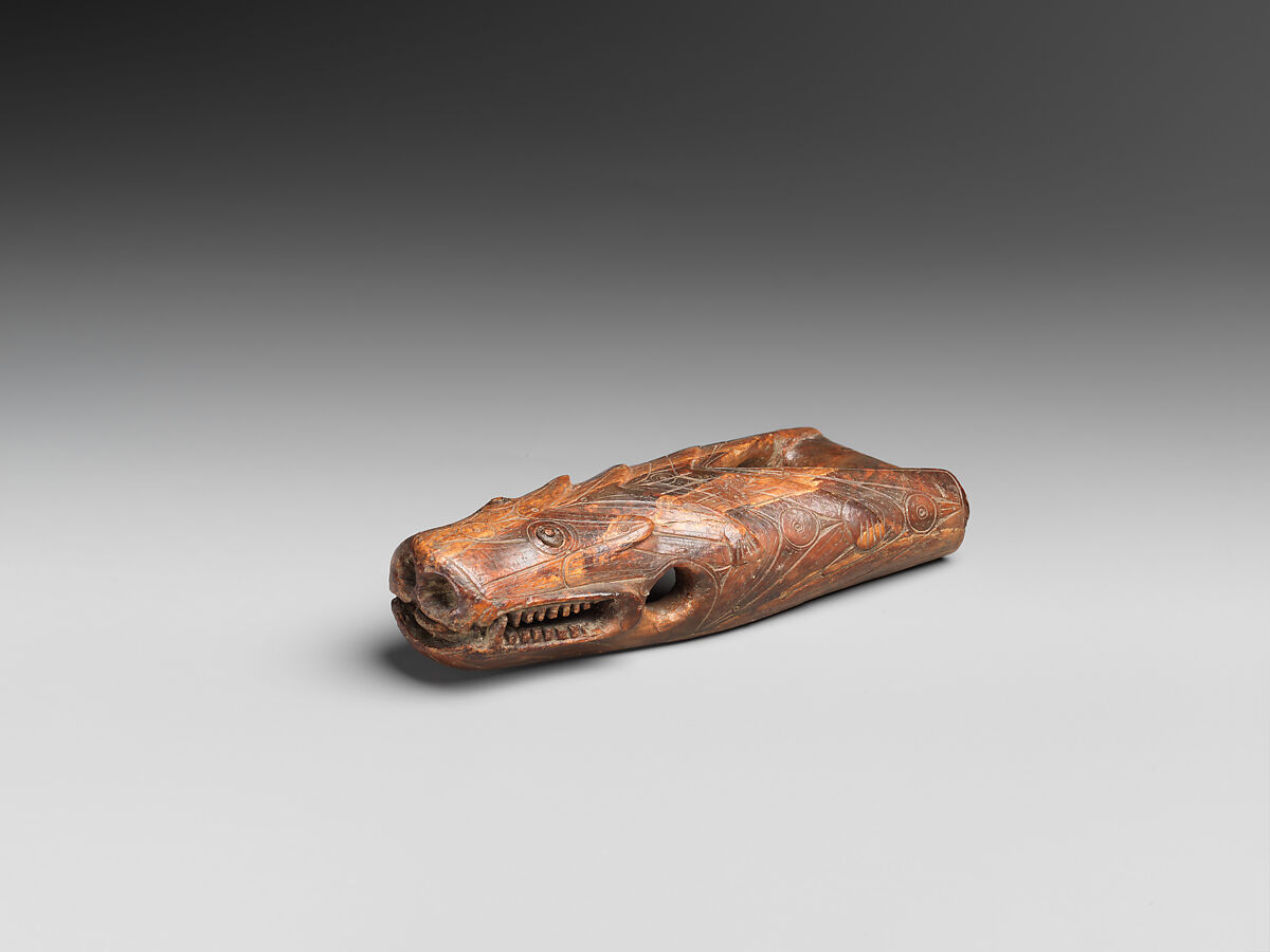 When early hunters succeeded in a big walrus kill, they transformed the animal’s precious ivory into finely wrought tools for their hunting kits. This toggle, carved in the form of a ferocious animal, possibly a sea lion, was attached to a harpoon and acted as a movable barb: when the body of a walrus was pierced, it prevented the spear from exiting the skin.