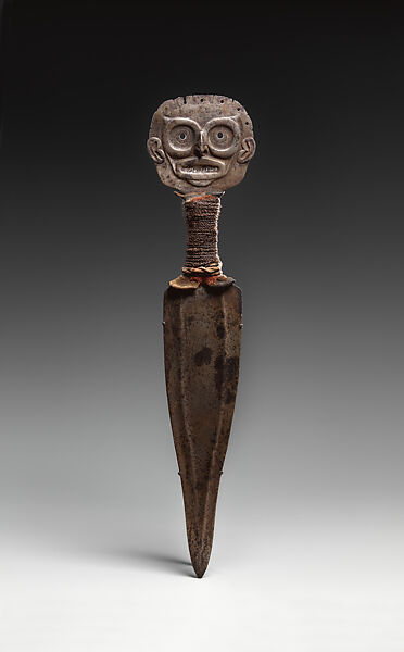This work of art is currently on loan to the museum.Forged from a single piece of iron, this dagger belongs to a group of related works whose subject is an emaciated shaman. The pommel has been transformed into a forbidding double-faced human head whose gaze and gaunt facial features may depict a being who fortified the weapon’s owner against evil forces. Perforations along the brow and the pierced septum of the figure’s aquiline nose may have once held adornments. The artist could have obtained the iron from a meteor or through trade. This work was an important heirloom passed down through the Lukaax.adi clan of Haines, Alaska, and was used in potlatch ceremonies.