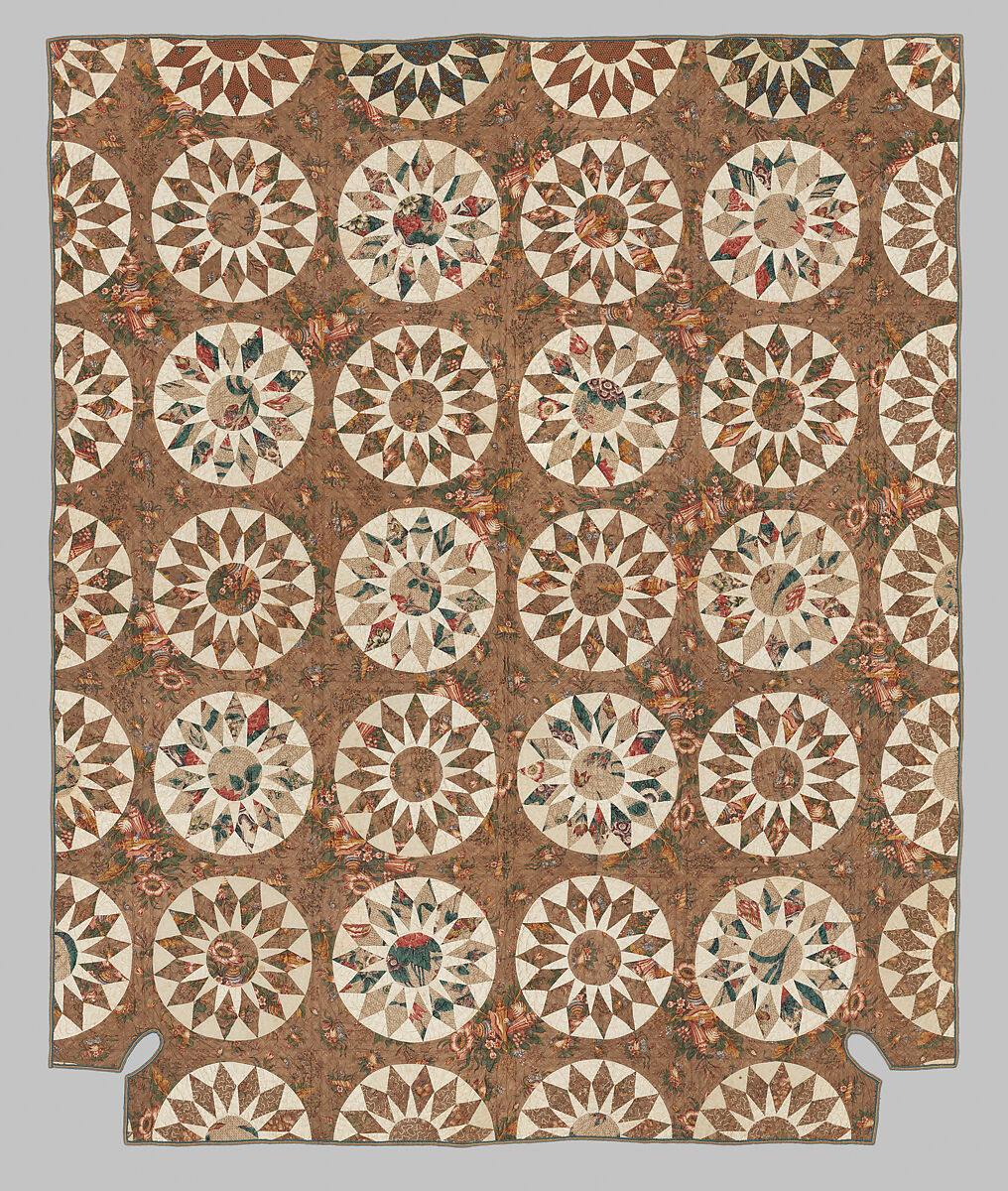 This quilt was made for a trundle bed or a child’s bed. The lower edge is shaped to fit around bed posts. It is composed of twenty full pieced Sunburst pattern blocks, sewn from a combination of imported 1830s English chintz and plain white cotton. The background fabric is a brown chintz, patterned with seashells and flowers in pinks, blues, greens and golds. Many of the pierced blocks use this same chintz to make up the sunburst pattern, but others of the blocks are patterned with four different contemporaneous chintzes. The sunbursts are hand-quilted with white thread in concentric circles, while the outer part of the blocks are quilted with straight lines following the edges of the block.