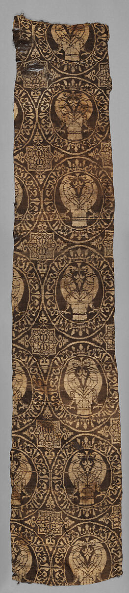 Although this textile has been identified as Seljuq, the very rounded cursive script of its inscription relates most closely to Il-Khanid tile inscriptions from the second half of the 13th century. Moreover, the use of roundels, while attested in Seljuq textiles, was equally popular under the Mongol Il-Khans. The depiction of the birds and palmettes is somewhat more simplified and stylized than those found on Seljuq textiles. This textile fragment, most likely from a robe, is decorated with a repeating pattern of a pair of addorsed regardant birds surrounded by an inscription band containing four iterations of the phrase "glory and dominion" in Arabic. The birds appear to be falcons, a symbol of power in the medieval eastern Islamic world. Following their conquests in Central Asia, Iran, and Iraq, the Mongol Il-Khans became very wealthy and developed a taste for silk garments that range from the most opulent and expensive cloths of gold to plain silk woven in various complex techniques.
