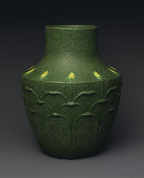 William H. Grueby founded his art pottery in Boston, Massachusetts, after first operating a successful tile works. His exposure to contemporary French ceramics at the 1893 World’s Columbian Exposition in Chicago marked a turning point in his career. He admired the novel matte glazes of the French studio potters, and was especially attracted to the relief designs he saw on the stoneware of August Delaherche. This vase with its design of stylized overlapping leaves and upright stems with buds is one of the closest to contemporary Delaherche examples. The interpretation by the Boston firm, however, is more rigid and contained than the French. Grueby developed his distinctive glazes, notably his dense, opaque matte green glaze, often with irregular veining that critics compared to the skin of a watermelon. Here, the green is enlivened only by the small touches of yellow on the buds. Most of his vessels feature relatively simple modeled decoration of stylized broad leaves. Many of his designers were conceived by Boston architects, George Prentiss Kendrick and Addison Le Boutillier. In customary practice, the throwing, glazing, and firing was done by men, and the decoration was executed by a small staff of mainly women. They would roll out thin ropes of clay and apply them to the vase’s surface, further modeling, tooling, and carving them to finish the designs.