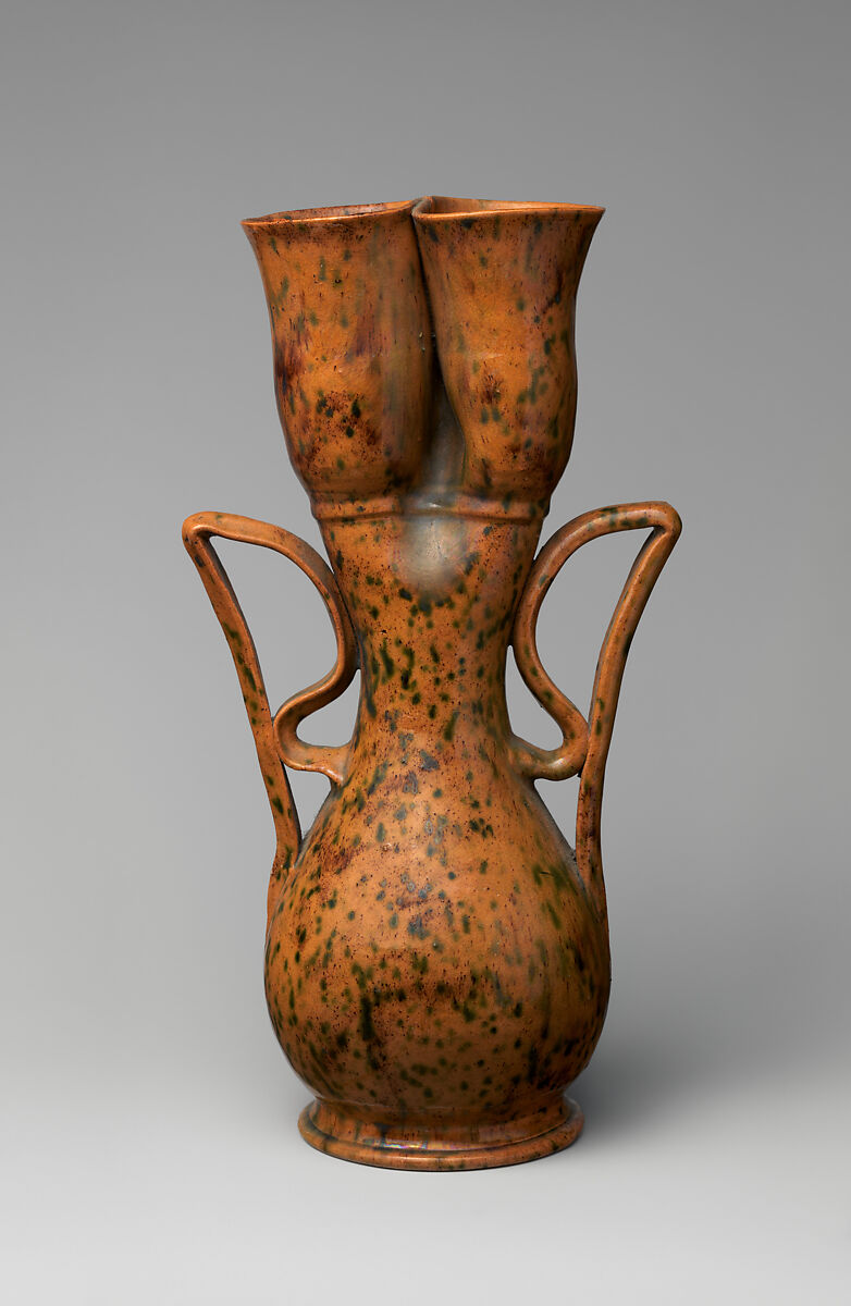 George Ohr of Biloxi, Mississippi, was arguably the quintessential American art potter: he built his own kiln, dug his clay, threw his vessels with extreme proficiency on the potter’s wheel to wafer thinness, altered those shapes, and then covered them with his own novel glazes. In form and decoration they are essentially Abstract Expressionist objects—almost 50 years before that movement was founded. These two vases illustrate especially well how Ohr’s lithe, flamboyant, ribbon handles transform a traditional vessel form. On one, the addition of the serpentine handles—with five points where the interior of the handle attaches to the body of the vase—give the vessel an entirely new profile. The second vase exhibits not only Ohr’s unusual serpentine handles, but also his fascination with altered form, where he squeezed and pinched the upper portion to form a double-necked vessel. The handles almost give the impression of wings attached to the slender waist of the vase. In both examples, the handles are reminiscent of the extravagant dragon stems on Venetian glass goblets.