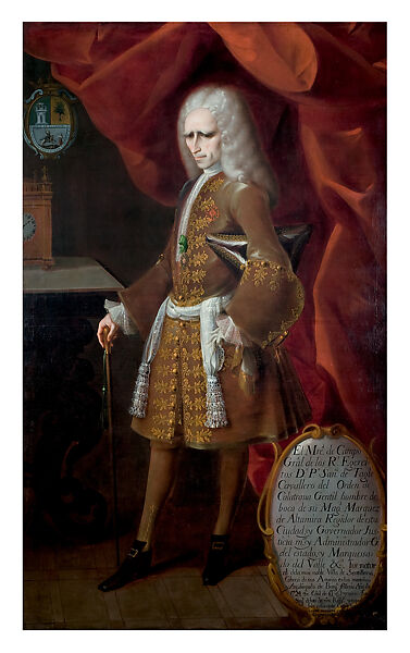 This work of art is currently on loan to the museum.Born in Santillana del Mar, Spain, Pedro Sánchez de Tagle immigrated to Mexico, becoming one of the most powerful merchants in the viceroyalty. He is portrayed wearing a fashionable powdered wig, brown jacket, and chapeau-bras (literally, "arm hat"). The red cross of the Order of Calatrava is prominently embroidered next to his heart.