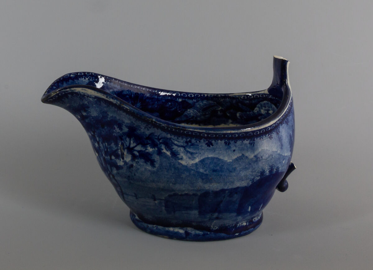 This blue and white transfer-printed earthenware sauceboat made by the Staffordshire firm of Enoch Wood & Sons features a view of the Hudson River and Catskill Mountains in New York. Influenced by the Romantic Movement, idealized views of the Hudson River region such as the one on the sauceboat were popular subjects for transfer-printed wares in an era when Americans were confronted with the reality of expanding urban landscapes of the Industrial Age. A direct product of new technological developments in the nineteenth century, a steamboat of the kind that facilitated tourism and the exploration of nature along the Hudson is pictured in the center of the view. Wood & Sons' view belongs to a series of approximately thirty-one American and Canadian views with symmetrical shell borders produced for the North American export market. The source of the view is unknown. The American Wing’s collection contains additional pieces by Wood & Sons. Refer to the Dictionary for a definition of the term "transfer printing" and for information about Wood & Sons.