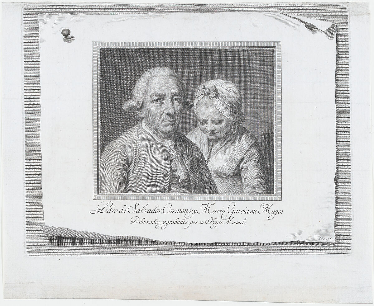 A significant printmaker who worked in Madrid, Salvador Carmona is little known outside Spain today. He made hundreds of prints, among them portraits, of which this is one of the most engaging. The inscription along the bottom records that it depicts his parents. The father, Pedro de Salvador Carmona, died the year the portrait was made, and thus it may be commemorative. In a clever demonstration of illusionism, the print presents the viewer with a visual challenge: it reproduces another engraving, with curling edges that project toward the viewer.
