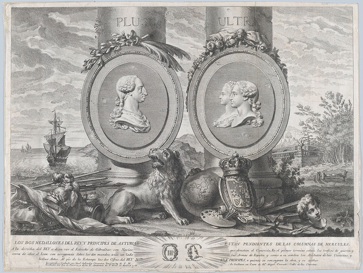 Two bust portraits of Carlos III at left and Carlos IV and Maria Louisa at right in roundels fixed to the columns of Hercules set within a landscape