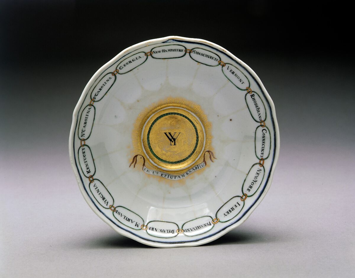 This saucer is part of an important tea service given to Martha Washington by A. E. van Braam Houckgeest, a Dutch merchant and commercial director of the Dutch East India Company, after he returned from China in 1796. Each link of the border chain contains the name of a state; a serpent biting its tail, symbolizing eternity, surrounds the chain. The owners initials are shown against the rays of the rising sun of the new Republic.