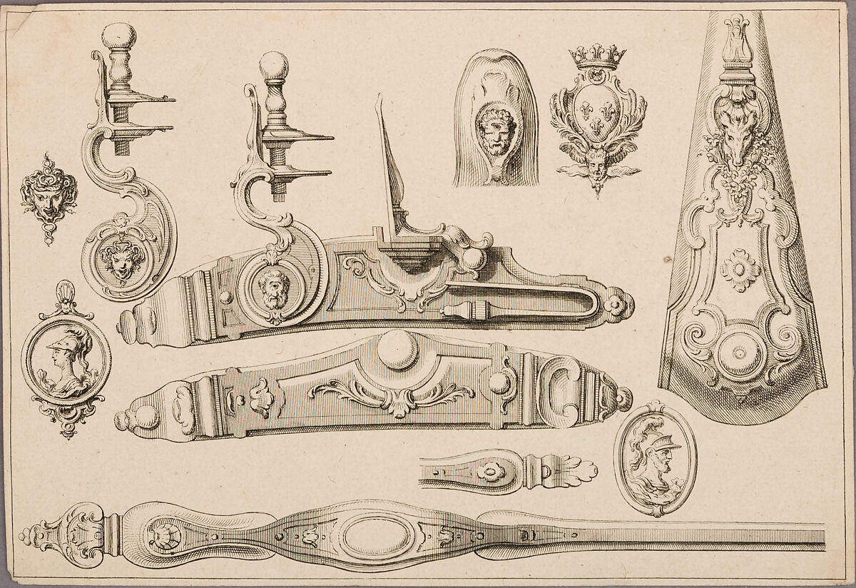 - Title: Design of a Flintlock, Side Plate, Butt Plate, and Trigger Guard, unnumbered plate from Nouveaux Desseins d'Arquebuserie Inventez et Gravez par Le Sr. Gillot