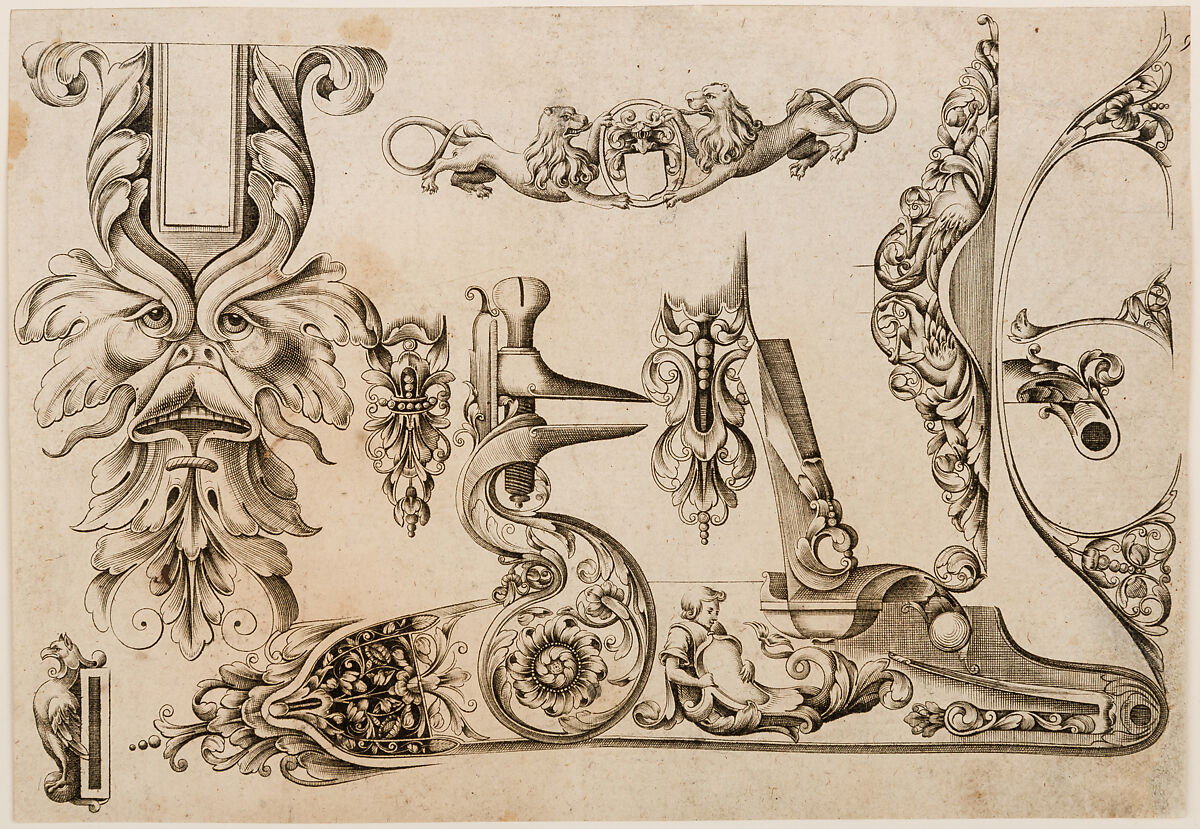 Little is known about the royal gunmakers, Thuraine and Le Hollandois, who published the pattern book from which this sheet comes. It remains a rare and important document of Parisian gunmaking and the leading style of firearms ornament early in the reign of Louis XIV.