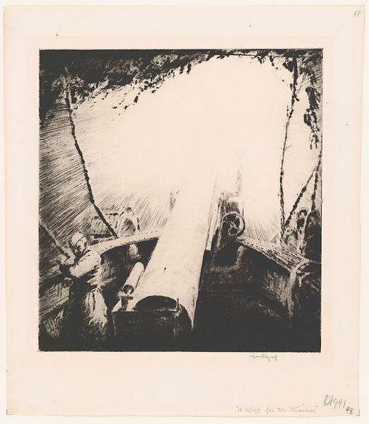 Based on events experienced by Eby’s unit in France, A Kiss for the Kaiser depicts the sheer power of World War I military technology, which unleashed an unprecedented level of devastation. While he fought in both world wars, the artist did not intend for his work to glorify combat, weaponry, or the wartime experience. World War I had a decisive effect on Eby’s art: before it began, he made landscapes and seascapes, but after witnessing its horrors, he wrote that the war had left him with "little taste for the more charming aspects of nature and with more of an awareness of the relentless elemental forces in our lives."