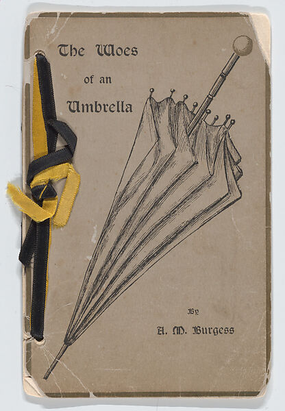 This small pamphlet traces the history of an expensive silk umbrella whose construction includes a “paragon spring,” patented by a New York inventor in 1875. Poetic text recounts how the umbrella dislikes being left with a "motley group" in the hall when taken to social events by its owner and then, after much use, is lent to a friend and never reclaimed.