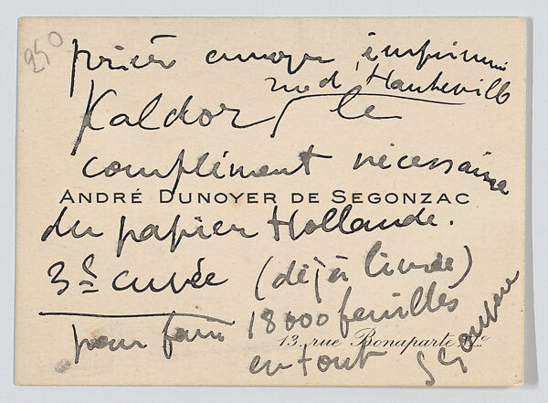 F. C. Schang donated 64 artists’ calling cards to The Met between 1977 and 1989. The calling cards are housed in an album that also includes Schang’s collection of stamps and other related ephemera. Calling cards derived from a custom, originating in England, in which messages were inscribed on the backs of playing cards. Cards made for the express purpose of sharing hand-written messages were manufactured beginning in the eighteenth century; by the early-nineteenth century, calling cards had become a popular means for sending well wishes, holiday greetings, condolences, and messages of courtship. On this calling card, Segonzac places an order with a paper dealer.