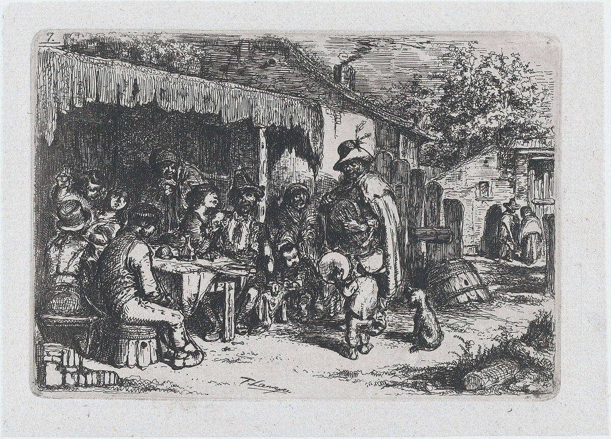 - Title: Plate 7: a street musician and a child accomplice playing before a group of seated figures, from "Customs and Pastimes of the Spanish People"